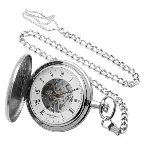 This Mechanical Wind-Up Pocket Watch is artisan crafted and includes a white dial, a skeletal design in the center and black roman numeral numbers. This Charles Hubert Mechanical Pocket Watch has a 17 Jewel Winding Movement and a Silver Tone Mineral Glass Casing.