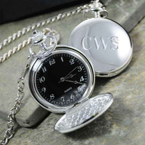 With the sophistication and style you can only get from a classic timepiece, this elegant pocket watch is timeless.A gracious groomsmen gift, it will be a handsome addition to wedding, evening or special occasion attire for gentlemen of all ages.Personalize it with their initials for a distinguished keepsake.Features and facts:Size: Measures 2 1/4" by 1 3/4" with a 12" chainMaterials: Silver-plated setting Can be engraved with up to3 block initials at no additional cost